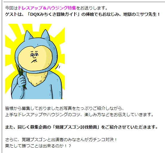 ワタシはこの番組、ゲームの開発にかかわっている方が、ドラクエⅩというオープンなソースを媒体になんやかんやわちゃわちゃやる雰囲気が気に入っていて、ニコニコ生放送は全部リアルタイムで見させていただいております。