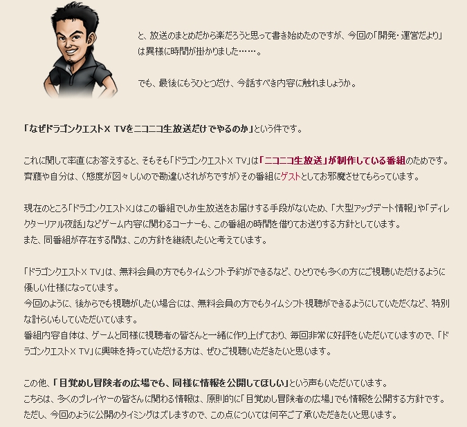 斉藤よーすぴがいくらドラクエTVでMCまがいのことをしようとも、堀井さんが「ドラクエ10おもしろいですよっ」ってPRしようとも、この作品、ドラゴンクエストⅩという作品においてはゲーム開発の仕様を解説される方がそれに該当するんです。